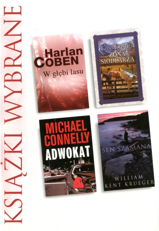 W GŁĘBI LASU: Pewnej letniej nocy czwórka nastolatków opuszcza skrycie wakacyjny obóz i udaje się w głąb bezkresnego lasu. Nikt z nich już nie wraca. Dwoje znaleziono zamordowanych. Dwoje zaginęło bez sladu, wśród nich Camille, siostra Paula Copelanda. Dwadzieścia lat później Paul dokonuje odkrycia, które zmusza go do konfrontacji dawnej wersji tragedii z nowymi faktami. Czyżby jego ukochana siostra wciąż żyła? ŻONA SIODLARZA: życie Ruby McGavin po tragicznej śmierci męża wydaje się bez perspektyw. Ale czeka ją niespodzianka. Okazuje się, że odziedziczyła część rozległego rancza położonego wśród malowniczych wzgórz Kalifornii. Jeszcze większy szok stanowi dla niej odkrycie, że rodzina męża, która rzekomo zaginęła przed laty w wypadku samochodowym, żyje i miewa się doskonale. Ruby pragnie tylko spokoju. Jednak gdy w tajemnicy odwiedzi swą nową posiadłość, znajdzie się w centrum rodzinnych waśni. ADWOKAT: kiedy adwokat Mickey Haller podejmuje się obrony niejakiego Louisa Rouleta, jest przekonany, że będzie to najbardziej intratna sprawa od wielu lat. W dodatku jedna z najprostszych, jakie kiedykolwiek prowadził. Mimo swej rutyny zapomina niestety, że na sali sądowej zdarzają się niespodzianki. Tu nie ma żadnych gwarancji. A ten, kto zadaje się z rekinami, może w każdej chwili paść ich ofiarą. SEN SZAMANA: Henry Meloux, szaman z plemienia Odżibwejów, jest ciężko chory. Przed smiercią pragnie tylko jednego - chce za wszelką cenę odnaleźć i zobaczyć spłodzonego przed laty syna. Wierzy w jego istnienie, gdyż widywał go w swoich proroczych snach. Meloux zwraca się z prośbą o pomoc do swego przyjaciela, byłego szeryfa, Corka O'Connora. I choć Cork całym sercem włącza się w poszukiwania, ostatnie zyczenie szamana wydaje się niemożliwe do spełnienia. [okładka]