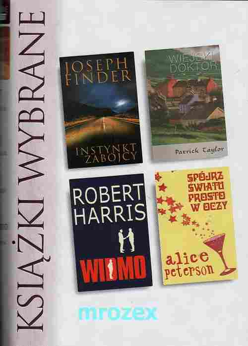 INSTYNKT ZABÓJCY: Jason Steadman, młody obiecujący pracownik wielkiej korporacji, jest ambitnym człowiekiem biznesu. Brak mu jednak instynktu zabójcy, który wyniósłby go na szczyty firmowej hierarchii. Sprawy nieoczekiwanie ulegają zmianie, gdy poznaje byłego oficera jednostki specjalnej Kurta Semkę. Czyżby to był przypadek, że kariera Jasona ulega gwałtownemu przyspieszeniu? A może wybrał sobie kumpla, jakiego nikomu nie należałoby życzyć? WIEJSKI DOKTOR: Wydarzyło się to we wczesnych latach sześćdziesiątych, w maleńkim miasteczku w Irlandii Północnej. A historia jest jak z bajki. Świeżo upieczony lekarz Barry Laverty szuka pracy... i miłości, jesli uda mu się ją znaleźć. Szczęśliwie dla siebie trafia do Ballybucklebo, gdzie budzący powszechny postrach despotyczny doktor O'Reilly bierze go pod swe skrzydła. Okazuje się również, że miłość czeka zaledwie jedną stację kolejową dalej. Czy Barry wykorzysta życiowe szans, które tak hojnie zesłał mu los? WIDMO: zawodowy pisarz do wynajęcia otrzymuje niecodzienną propozycję. Ma pisać wspomnienia byłego brytyjskiego premiera Adama Langa. Przekonany, że trafia się mu nielada gratka, podejmuje się tego pozornie łatwego zadania. Kiedy jednak dociera na wyspę Martha's Vineyard i w położonym na odludziu domu przystępuje do przeprowadzenia wywiadu, okazuje się, że wpadł w tarapaty, jakich nigdy nie mógł przewidzieć. SPÓJRZ ŚWIATU PROSTO W OCZY: Katie Flecher, modna londyjńska projektantka, stara się unikać wszelkich kontaktów ze swoją rodziną. Jednak pewnego dnia spokój jej elaganckiego życia gwałtownie pryska, gdyż do Londynu przybywa z prowincji jej młodsza siostra. Bells w niczym nie przypomina ślicznej Katie, która w obawie przed kompromitacją usiłuje szybko pozbyć się niewygodnego gościa. Trwa to jednak do czasu, gdy spojrzy na siostę oczyma innych ludzi. Do czasu, gdy zrozumie, co naprawdę znaczy kochać i być kochaną. [okładka]