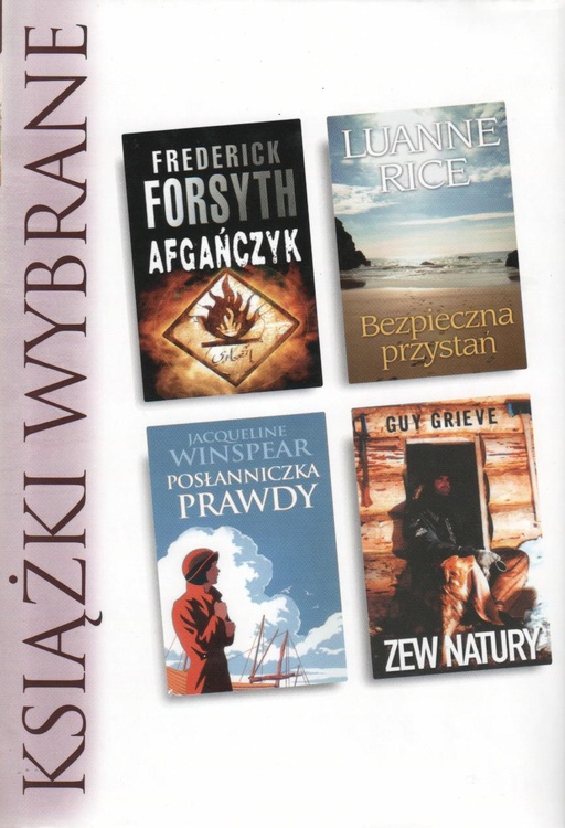 "Afgańczyk": Światem wkrótce wstrząśnie niewyobrażalny akt terroru. Jego cel, miejsce i czas to ścisle strzezona tajemnica. Al Kaida znów wkracza do akcji. Słynny afgański wojownik Ismat Khan, więziony w bazie Guantanamo na Kubie, odmawia wszelkich zeznań. Tymczasem zachodnie wywiady podejmują śmiertelnie niebezpieczną grę operacyjną. W miejsce więzionego taliba podstawiają swojego agenta - płk. Mike'a Martina. Bohaterski komandos ma dotrzeć do serca al Kaidy. to jedyny ratunek dla zachodniej cywilizacji. "Bezpieczna przystań": W życiu Dany Underhill, malarki o rosnącej międzynarodowej sławie, następuje bolesny przełom. Jej karierę i plany osobiste niweczy tragiczna śmierć ukochanej siostry. Dana przestaje widzieć sens uprawiania sztuki. Porzuca malarstwo i opuszcza Francję. Powraca do Connecticut, by zaopiekować się dwiema osieroconymi siostrzenicami. Rodzina potrzebuje teraz jej pomocy. I to jest najważniejsze. Malarstwo może zaczekać. Ale miłość okazuje się znacznie mniej cierpliwa. "Posłanniczka prawdy": Londyńskim światem artystycznym wstrząsa tragiczne wydarzenie. W przeddzień długo oczekiwanego wernisażu swych dzieł ginie Nick Bassington-Hope,-kontrowersyjny malarz o słynnym nazwisku. Mimo, że policja uznaje to za nieszczęśliwy wypadek, panna Maisie Dobbs - psycholog i detektyw-nie daje wiary takiej wersji. Wytrwale i konsekwentnie prowadząc własne śledztwo, odkrywa fakty, które rzucają nowe światło na tajemnicę życia i śmierci wybitnego artysty. "Zew natury": Spętany niewolą i monotonią biurowej rutyny Guy Grieve marzy o ucieczce od cywilizacji. Wierzy, że znajdzie miejsce, w którym, żyjąc w zgodzie z naturą, posłuszny jej prawom, odkryje prawdę o sobie. Gdy jego marzenia stają się obsesją, Guy postanawia je urzeczywistnić. Wyznacza sobie ambitny cel. Będzie nim Alaska. Zbuduje tam chatę z bali, nauczy się polować, samotnie przetrwa zimę w borealnych lasach. Rezygnuje z pracy, żegna się z rodziną. Wyrusza na spotkanie wielkiej przygody. [okładka]