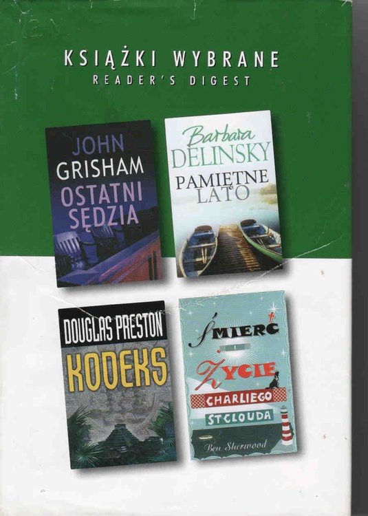 "Ostatni sędzia": Padgittowie to najpotężniejsza rodzina w hrabstwie Ford. Zbili ogromną fortunę na nielegalnych interesach, lecz dzięki łapówkom i terroryzowaniu współobywateli zawsze wszystko uchodziło im bezkarnie. Kiedy więc Danny Padgitt zostaje aresztowany za morderstwo, jego proces okazuje się najbardziej sensacyjnym wydarzeniem w dziejach miasteczka Clanton..."Śmierć i życie Charliego St. Clouda": Jesli dasz słowo najukochańszej osobie, nie wolno Ci go złamać. Dlatego Charlie St. Cloud przez trzynaście lat dotrzymywał obietnicy, zaniedbując własne życie. Nie sposób jednak żyć zawsze przeszłością. W końcu trzeba otworzyć serce..."Kodeks": Bracia Broadbentowie, Philip, Vernon i Tom, przybywają na wezwanie ojca do luksusowej rezydencji na obrzeżach Santa Fe w Nowym Meksyku. Zastają dom pusty i ogołocony ze skarbów. Poczatkowo sądzą, że został obrabowany, rychło jednak okazuje się, że to ich ojciec - miliarder, wyznaczył synom dziwne, śmiertelnie niebezpieczne zadanie..."Pamiętne lato": Zdarzają się chwile, które na zawsze zmieniają życie. A co dzieje się potem? [okładka]